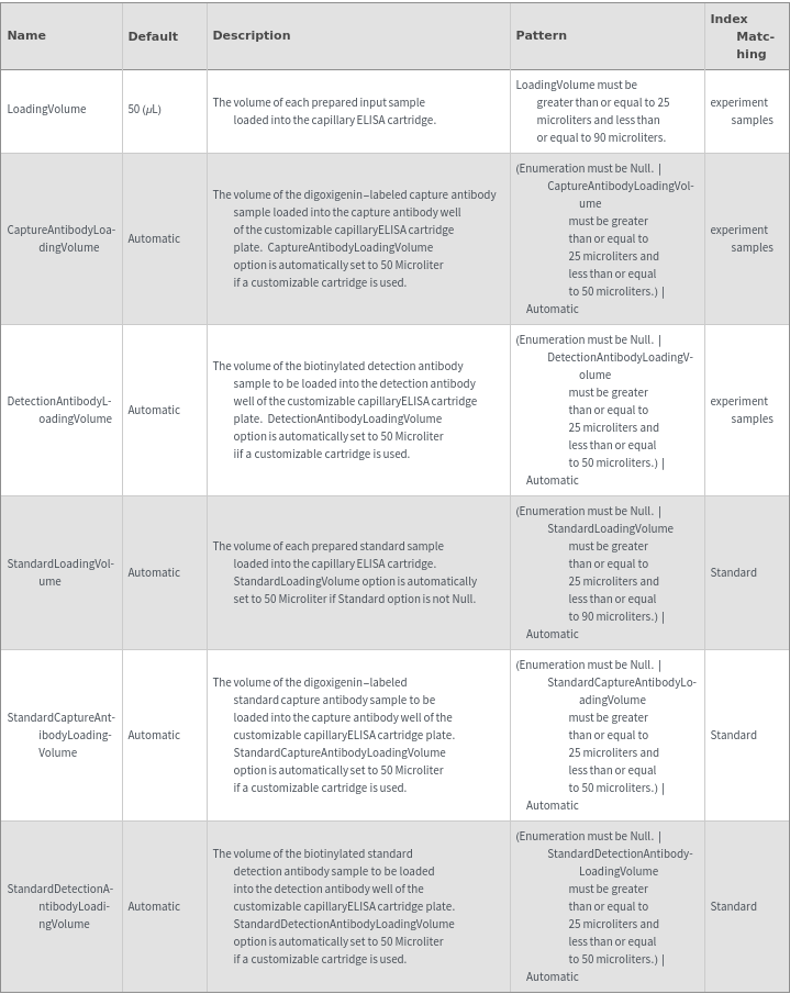 Display the option values which will be used in the capillary ELISA experiment with a customizable cartridge: