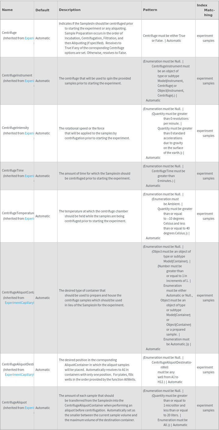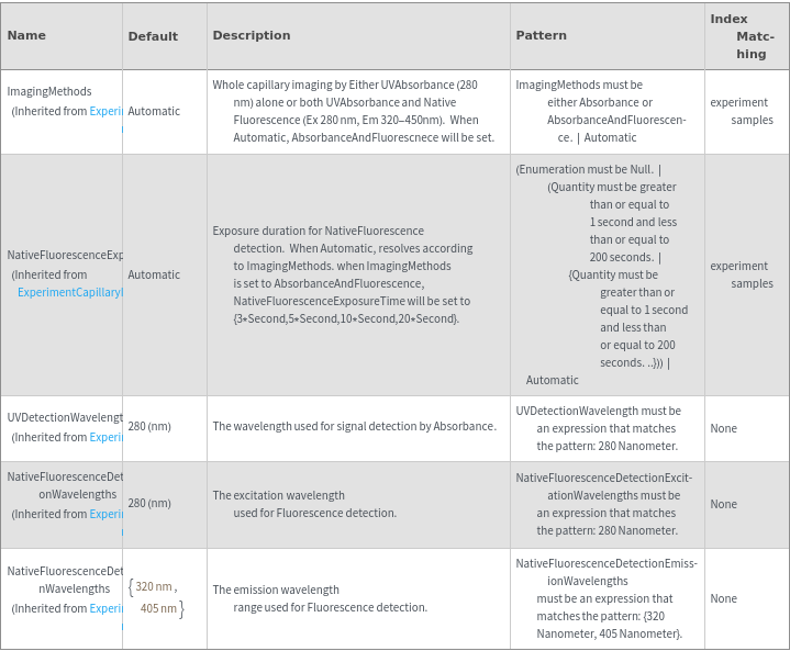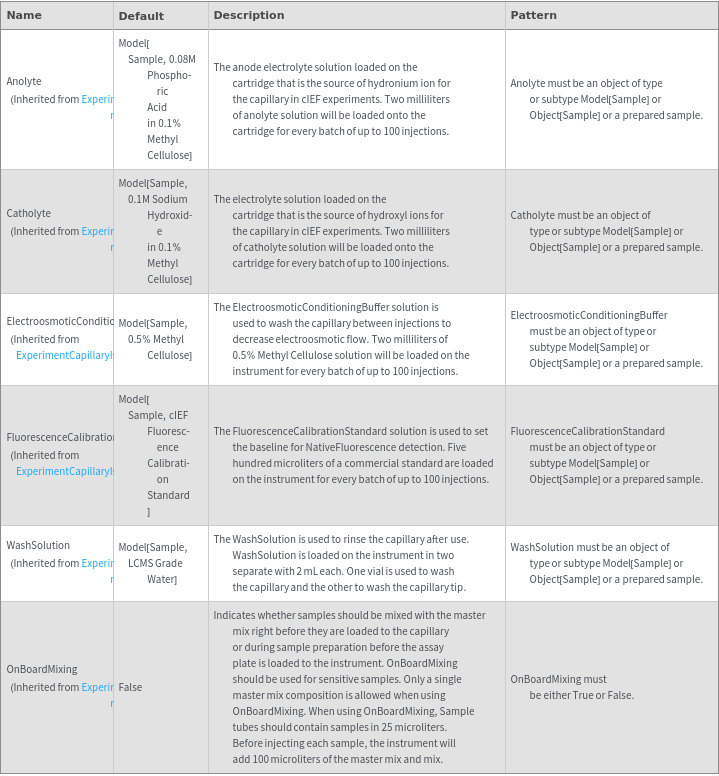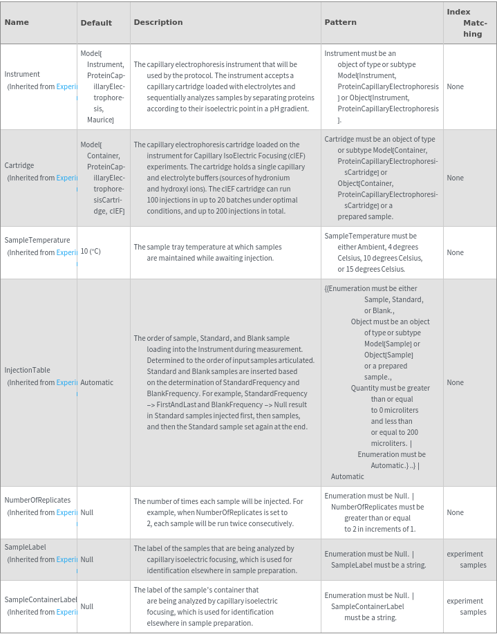 • The options returned by ExperimentCapillaryIsoelectricFocusingOptions may be passed directly to ExperimentCapillaryIsoelectricFocusing.
