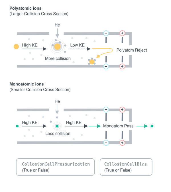 Indicate if the collision cell should be pressurized. If the collision cell is pressurized, gas inside will collide with the analyte ions as the ion pass through it. Since polyatomic ions are larger than monoatomic ions they are more likely to collide with the gas, and therefore been blocked from entry of the quadrupole. See Figure 3.2 for more details.