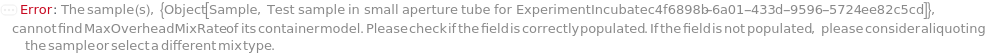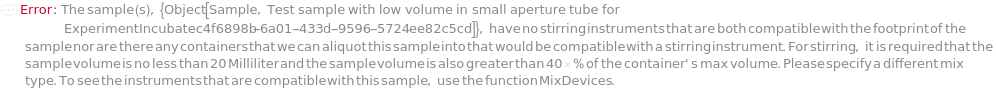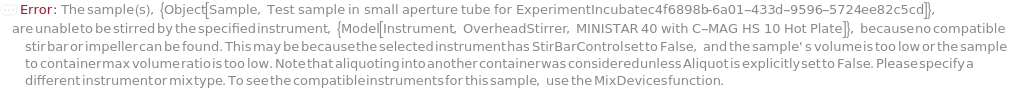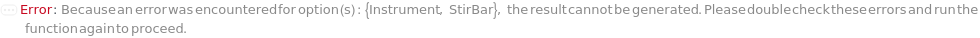 Default Calculation: If MixRate is above 1000 RPM, or if no compatible impeller can be found for the given stirrer, StirBar is automatically set to the largest compatible stir bar found. Here, a compatible impeller means that it can fit in the aperture of the sample's container, can reach the bottom of the sample's container, and is compatible with the stir instrument given; a compatible stir bar means that its width can fit in the aperture of the sample's container and that its length is not greater than the InternalDiameter of the sample's container. Otherwise set to Null.