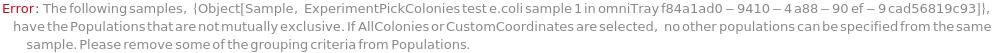 For each sample, the criteria used to group colonies together into a population to pick. Criteria are based on the ordering of colonies by the desired feature(s): Diameter, Regularity, Circularity, Isolation, Fluorescence, and BlueWhiteScreen. Additionally, CustomCoordinates can be specified, which work in conjunction with the PickCoordinates option to select colonies based on pre-determined locations. For more information see documentation on colony population Unit Operations: Diameter, Isolation, Regularity, Circularity, Fluorescence, BlueWhiteScreen, MultiFeatured, and AllColonies under Experiment Principles section.