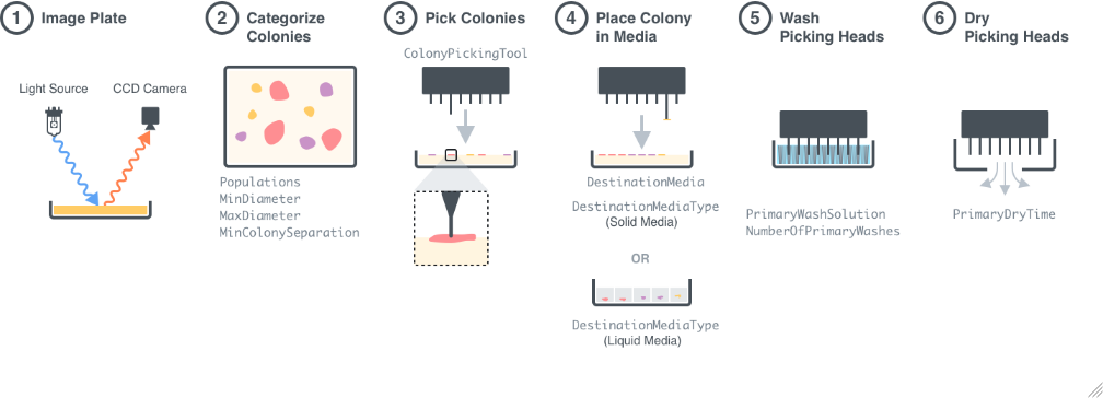 Figure 1.1: Procedural Overview of a PickColonies experiment using a QPix 420 HT Colony Picker. Step 1: Samples are imaged using the CCD camera on the instrument. Step 2: The images are analyzed by the function AnalyzeColonies in order to find the locations of the colonies on the plates. Step 3: The selected colonies are picked by the QPix 420 HT colony picking tool. Step 4: The picked colonies are placed on the desired media. Step 5: The colony picking tool is washed in sanitization solution. Step 6: The colony picking tool is dried by a fan.