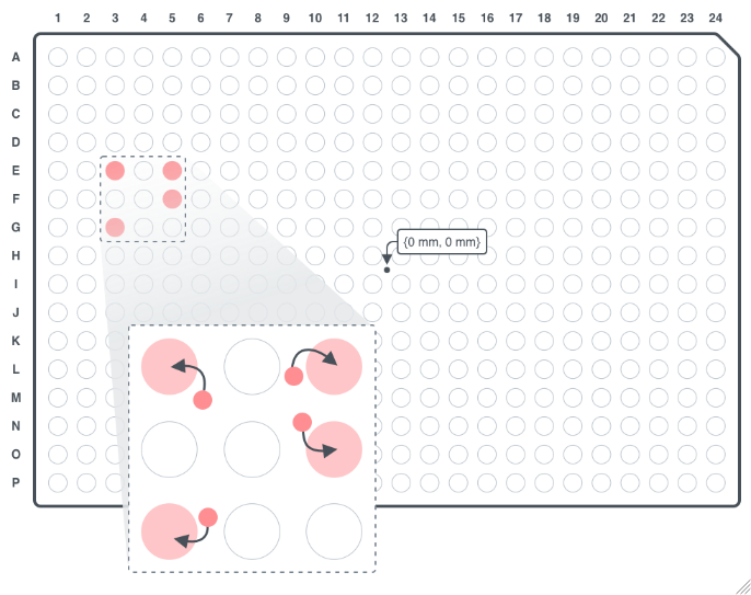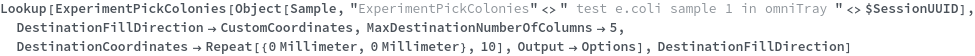 Have the picked colonies placed onto SolidMedia by specifying a custom placement pattern, so they can be further grown. {0 Millimeter, 0 Millimeter is the center of the destination well}:
