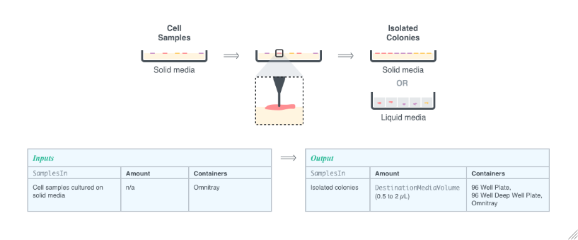 Pick Colonies allows for the isolation of microbial colonies growing on top of a solid medium to duplicate them for further use. The colonies are picked with a thin needle and then transferred to a desired media. The picked colonies can either be placed onto solid or liquid media and then grown and use for further analysis.