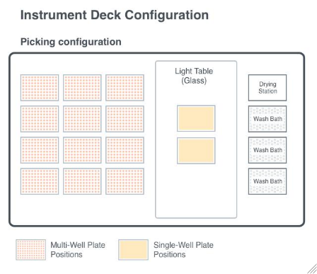 Figure 3.1: Diagram of the deck layout of the ColonyHandler. The ColonyHandler is equipped with colony picking tool. In the picking configuration, the deck features designated positions for multi-well plates, single-well plates inside of light table, and wash baths.