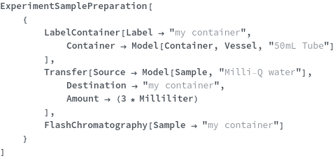 FlashChromatography can be used as part of an ExperimentSamplePreparation call and can accept a container label: