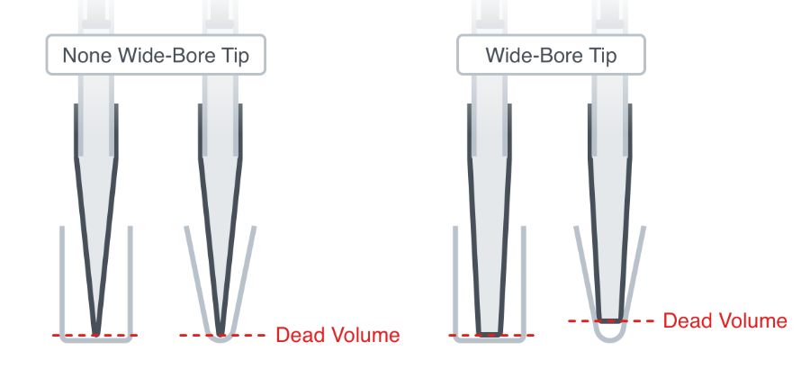 In robotic liquid transfer or pipette mix, when using wide bore Hamilton pipette tips to aspirate samples from VBottom containers, higher dead volumes are required to guarantee the successful transfers. Please make sure the samples have enough volumes if usage of wide bore tips is desired.