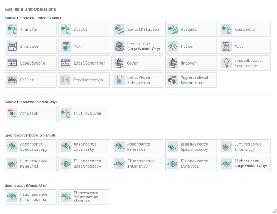 ExperimentManualSamplePreparation supports all plate reader experiments (AbsorbanceSpectroscopy, AbsorbanceIntensity, AbsorbanceKinetics, LuminescenceSpectroscopy, LuminescenceIntensity, LuminescenceKinetics, FluorescenceSpectroscopy, FluorescenceIntensity, FluorescenceKinetics, FluorescencePolarization, FluorescencePolarizationKinetics, AlphaScreen, Nephelometry, and NephelometryKinetics). This is in contrast to RoboticSamplePreparation which cannot perform Nephlometry, NephlometryKinetics, FluorescencePolarization, and FluorescencePolarizationKinetics since these require the NEPHELOstar and PHERAstar plate readers which are not integrated onto a STAR liquid handling robot. Nephelometry measurements can however be performed in RoboticCellPreparation since Nephelometers are integrated onto the bioSTAR/microbioSTAR: