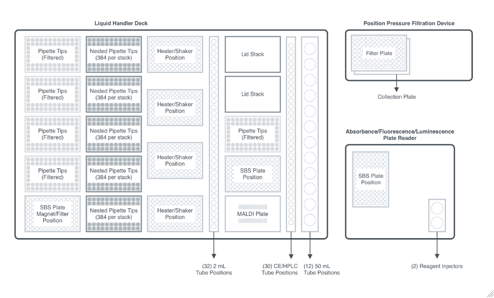 Figure 2.1.1: An overview of the robotic workcell. It is capable of processing plate operations including incubation, shaking, and magnetic bead separation on-deck and filtration and absorbance/fluorescence/luminescence measurement off-deck, with a robot arm facilitating the plate movements.