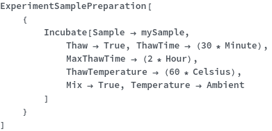 Thaw the samples before mixing at 50 Celsius. The sample will be thawed for a minimum of 30 Minutes, then will continue being thawed for up to 2 Hours, until it is completely thawed. Samples always go through the thaw stage (if Thaw->True) before they are mixed/incubated: