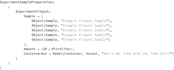 To make multiple, identically sized aliquots of a single source sample, the source needs to be explicitly specified for each intended aliquot. For example, to make five 50 Microliter aliquots from a sample into 0.5 Milliliter tubes: