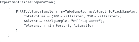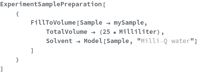 To specify the volume to which the sample should be filled and the solvent with which to do it, set the TotalVolume and Solvent options: