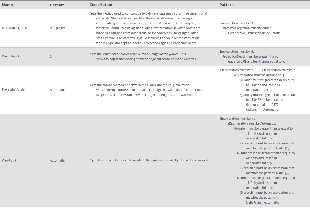 When PlotType is set to WaterfallPlot and WaterfallProjection is set to Parallel, ProjectionAngle sets the angle between the X and Z axes: