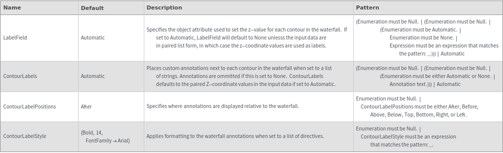 When PlotType is set to WaterfallPlot, ContourLabelPositions specifies where each annotation is placed relative to the contours: