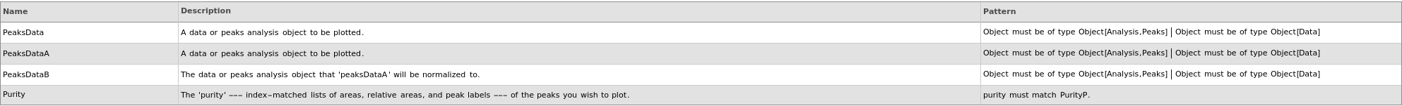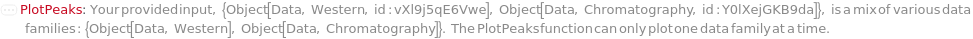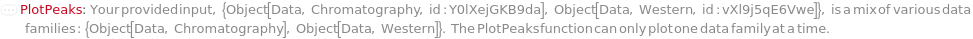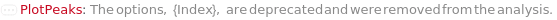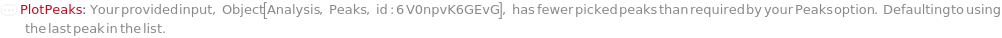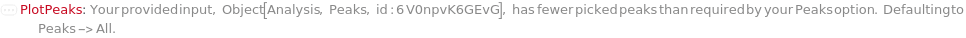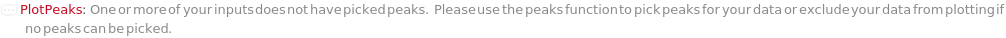 DeprecatedOptions The options, `1`, are deprecated and were removed from the analysis. DifferentDataFamilies Your provided input, `1`, is a mix of various data families: `2`. The PlotPeaks function can only plot one data family at a time. NoPeaks One or more of your inputs does not have picked peaks. Please use the peaks function to pick peaks for your data or exclude your data from plotting if no peaks can be picked. TooFewPeaks Your provided input, `1`, has fewer picked peaks than required by your Peaks option. Defaulting to `2`.