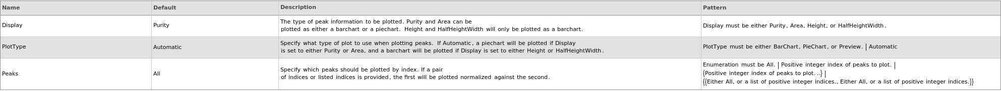 produces either a piechart or barchart showing the Purity (relative areas) of a set of peaks.