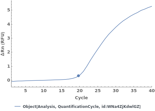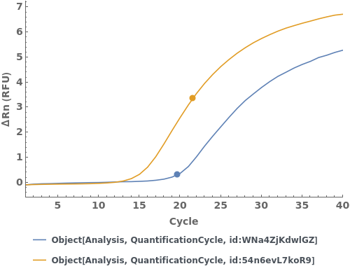 plots the normalized and baseline-subtracted amplification curve and quantification cycle from each quantification cycle analysis object in quantificationCycles.