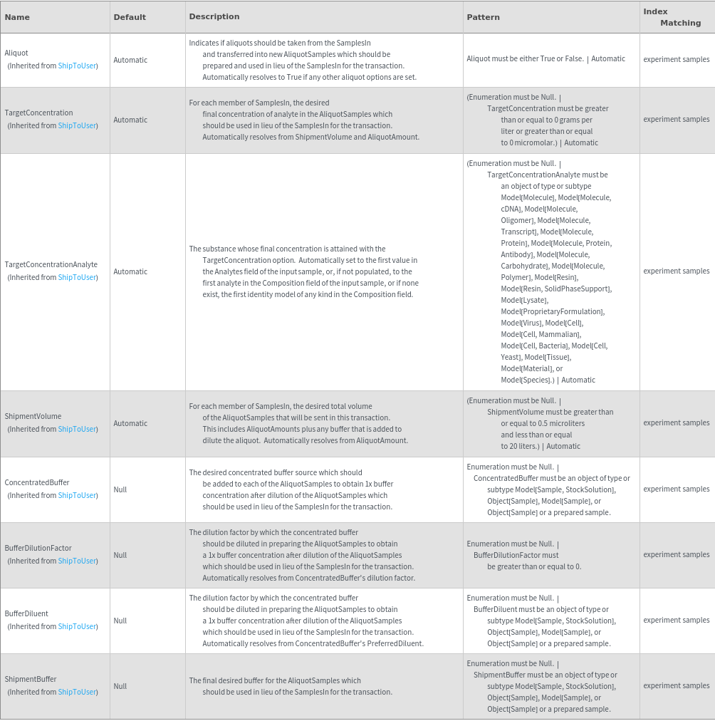 Indicate if aliquots should be taken from the SamplesIn and prepared to be used in lieu of the SamplesIn in the transaction. If aliquoting, you must specify a valid combination of aliquot options to indicate how the samples should be prepared. (Case where samples are at multiple sites):
