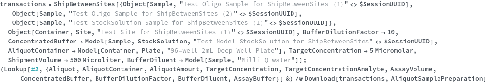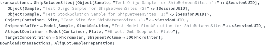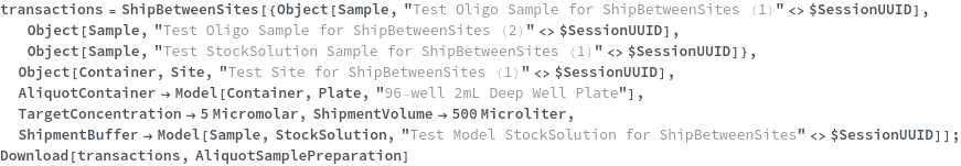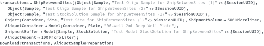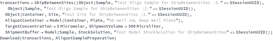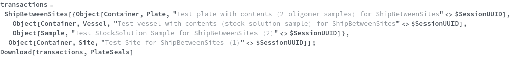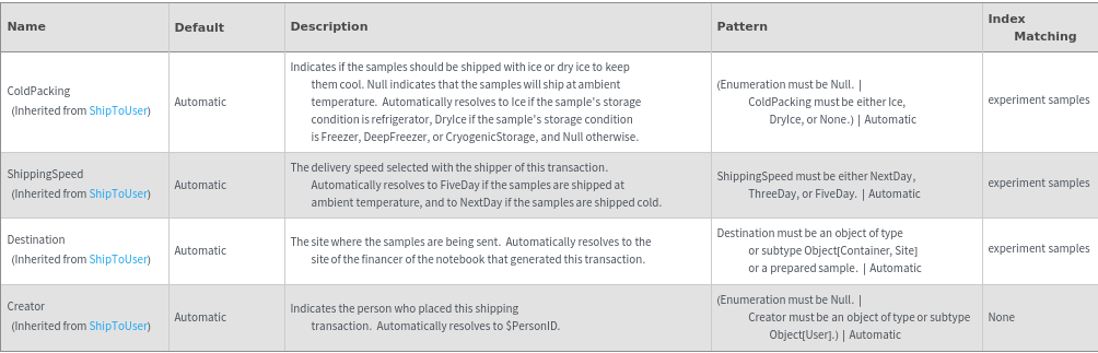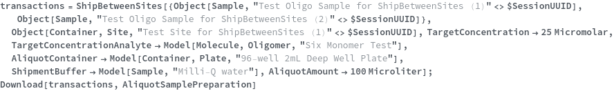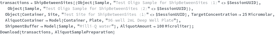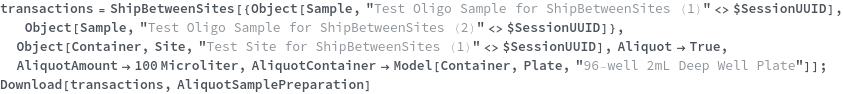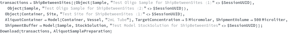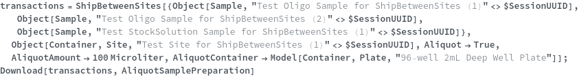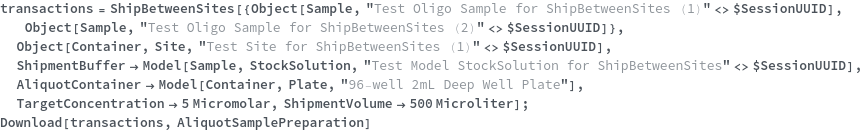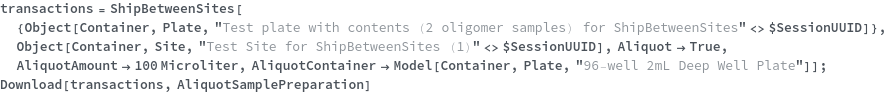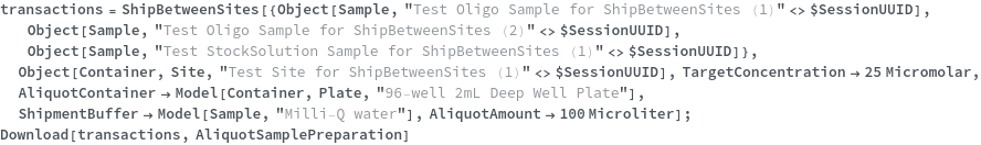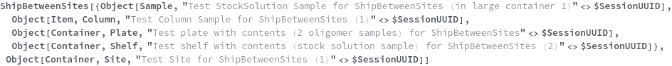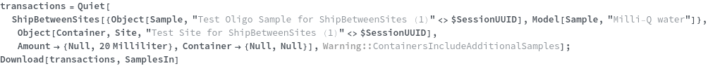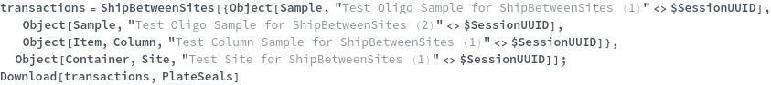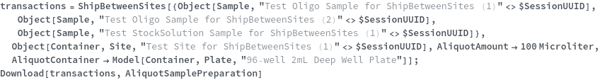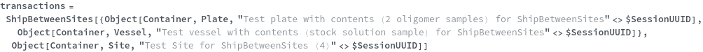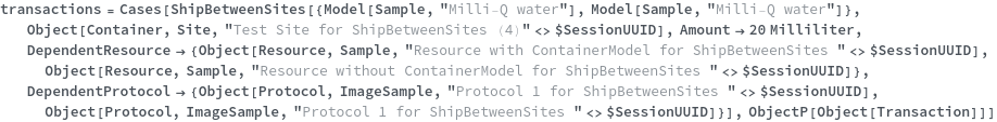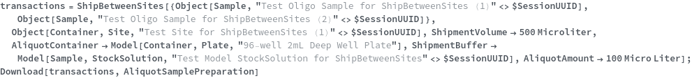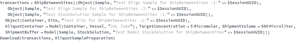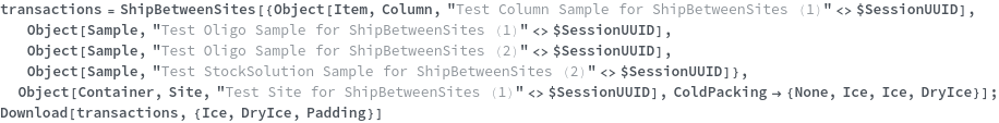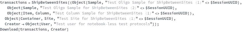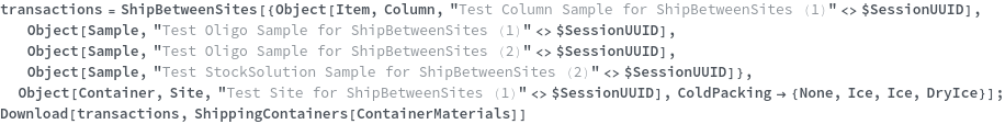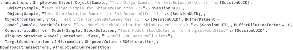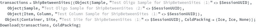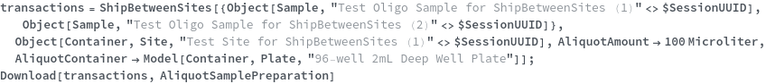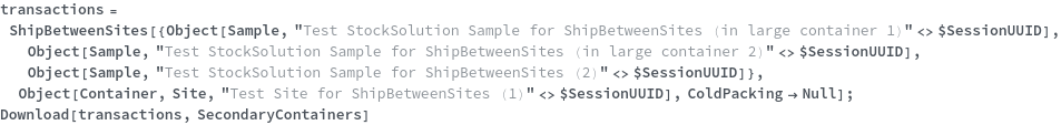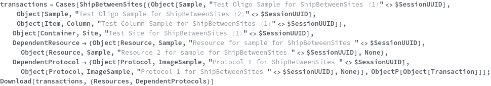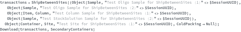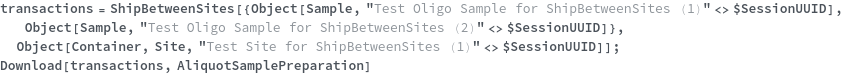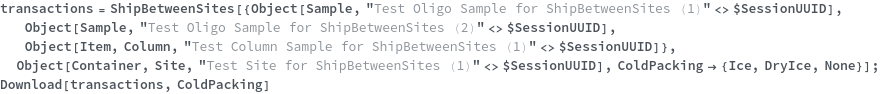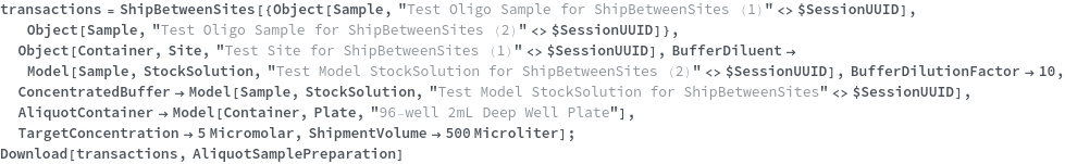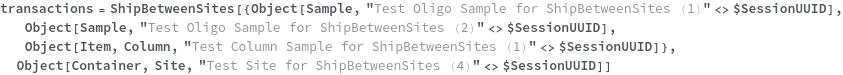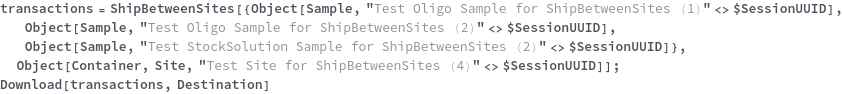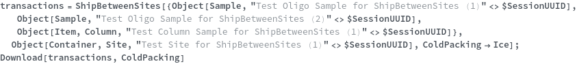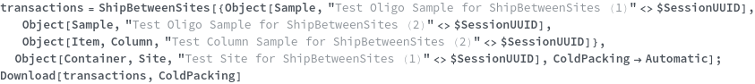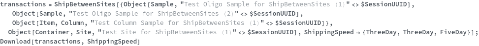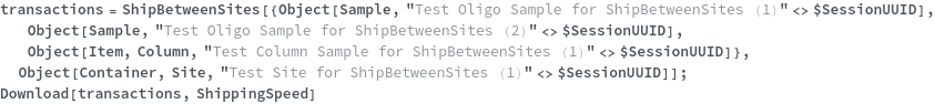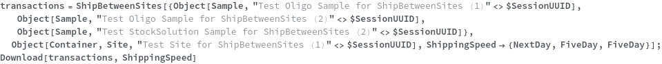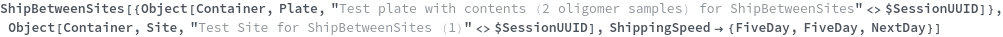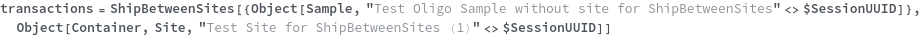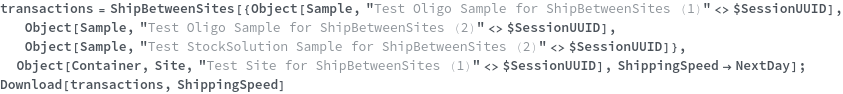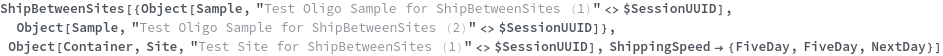 • ShipBetweenSites is used for resource fulfillment in cases where a non-purchasable or high-cost Sample, Container, or Item is required by a protocol but located at a different site. This allows the customer to seamlessly perform experiments without worrying about the logistics of their sample locations.