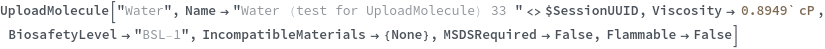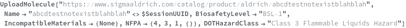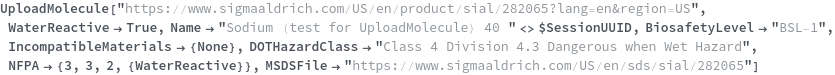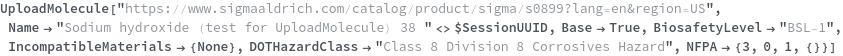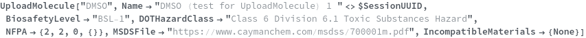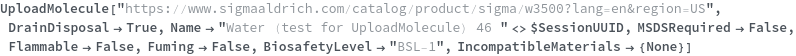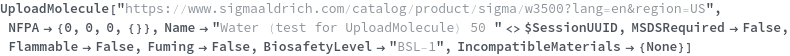 Use the BiosafetyLevel option to specify the biosafety level of this chemical sample. The valid value of this options can be found by evaluating BiosafetyLevelP ("BSL-1","BSL-2","BSL-3","BSL-4"). The following chemical (purified water) has a classification of "BSL-1":