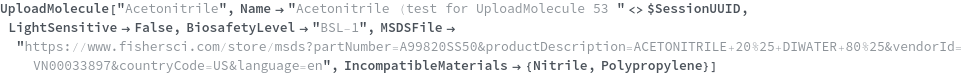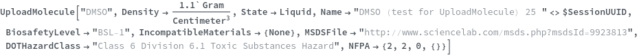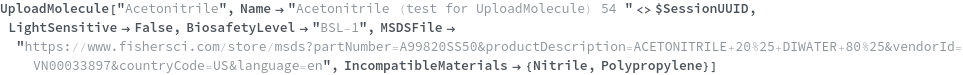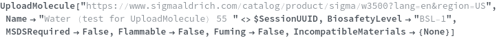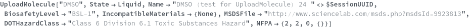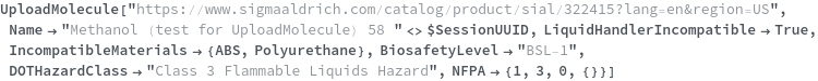 Use the LiquidHandlerIncompatible option to specify that the chemical sample cannot be reliably aspirated or dispensed by a liquid handling robot. In the following example, Methanol cannot accurately be aspirated by a liquid handling robot so LiquidHandlerIncompatible->True: