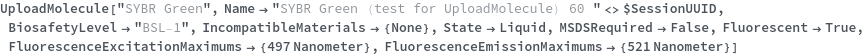 Use the ExtinctionCoefficients option to set the Extinction Coefficient of this uploaded chemical. This field is in the format {{Wavelength,ExtinctionCoefficient}..}: