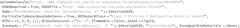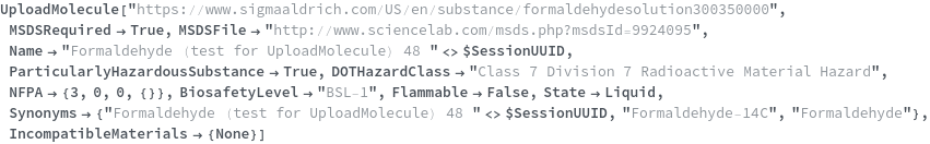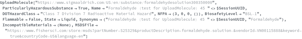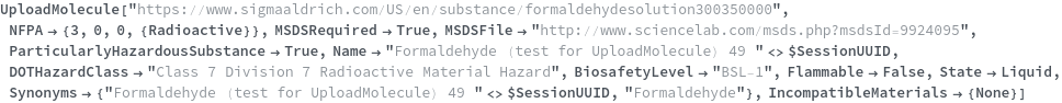 Use the NFPA option to specify the National Fire Protection Association (NFPA) 704 Hazard diamond classification of this substance. This option is specified in the format {HealthRating,FlammabilityRating,ReactivityRating,SpecialConsiderationsList}. The valid symbols to include in SpecialConsiderationsList are Oxidizer|WaterReactive|Aspyxiant|Corrosive|Acid|Bio|Poisonous|Radioactive|Cryogenic|Null. The following chemical, formaldehyde, as an NFPA of {3,0,0,{Radioactive}} which means that its Health rating is 3, its Flammability rating is 0, and its Reactivity rating is 0. The special consideration of this chemical is that it is radioactive: