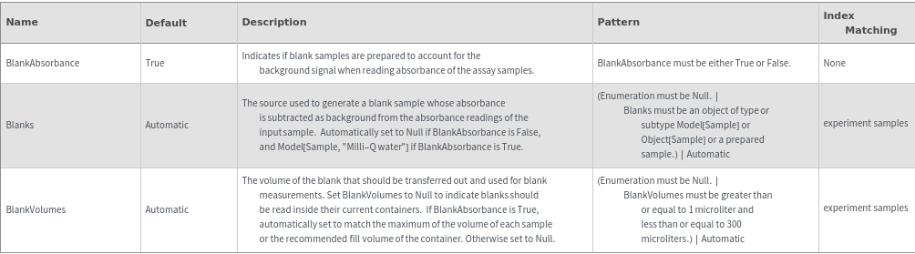 Returns an error if BlankAbsorbance -> True and BlankVolumes -> Null: